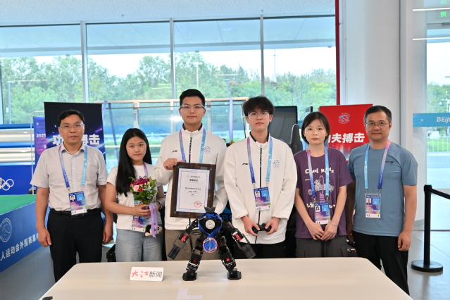 8月16日,由北京市人民政府、中央广播电视总台、世界机器人合作组织、亚太机器人世界杯国际理事会联合主办的2025世界人形机器人运动会功夫搏击赛在北京国家速滑馆举办。经过激烈角逐,东华理工大学代表队凭借出色表现,最终荣获该项赛事亚军。 参赛队员与其机器人选手共同登上了这一被誉为机器人界“奥运会”的最高领奖台。