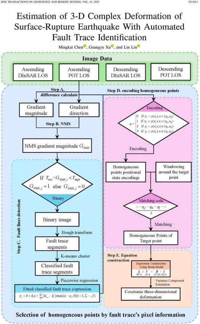 近日,东华理工大学测绘与空间信息工程学院许光煜副教授研究团队在中科院SCI一区TOP期刊《IEEE Transactions on Geoscience and Remote Sensing》(最新影响因子:8.6)发表题为Estimation of 3-D Complex Deformation of Surface-Rupture Earthquake With Automated Fault Trace Identification的最新研究成果。测绘科学与技术专业2020级硕士研究生陈明锴为论文第一作者,许光煜为通讯作者。