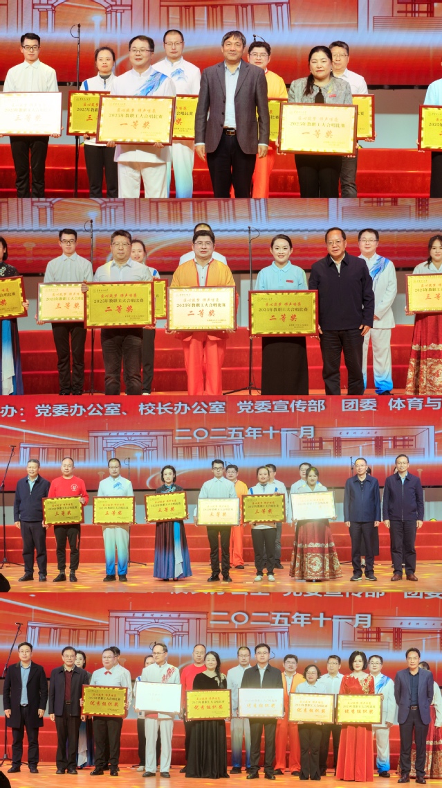 11月13日晚,东华理工大学“匠心筑梦 师声嘹亮”2025年教职工大合唱比赛在南昌青岚校园活动中心举行。校党政领导班子成员罗仙平、夏菲、杨波、熊国保、李满根、张立亭、刘剑斌、金建华出席。学校各职能部门、各学院师生代表1100余人到场观看演出。