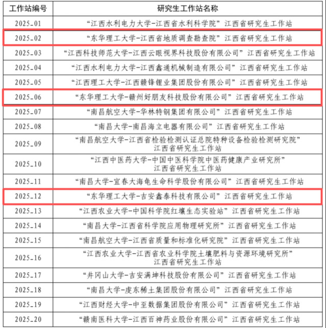 近日,第四批江西省研究生工作站建设名单正式公布,东华理工大学申报的“东华理工大学-江西省地质调查勘查院”“东华理工大学-赣州好朋友科技股份有限公司”“东华理工大学-吉安鑫泰科技有限公司”3个研究生工作站成功获批,获批数量在本批次中位居全省前列。