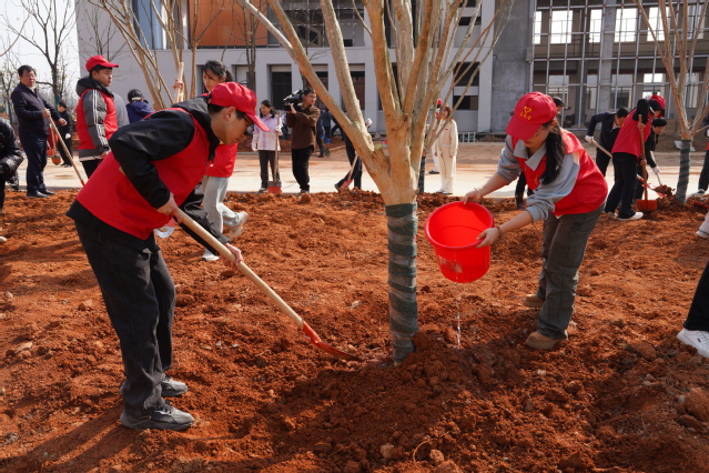 植树现场,处处是忙碌的身影。范小林、胡剑飞、王宏安、刘丽、张福庆等手持铁锹、踩着泥泞,来到植树点。大家一同挥锹挖坑、扶苗培土、围堰浇水,每道工序都一丝不苟。活动期间,市领导与校领导共同为当天栽植的一株抚州市市花——玉茗花(山茶花)悉心培土、浇灌,寓意校地合作如花绽放、历久弥香,也为即将迎来七十华诞的东华理工大学送上美好祝愿。