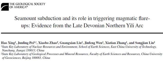 近日,东华理工大学地球与行星科学学院邢浩博士以第一作者身份,在地球科学领域国际权威期刊《Geological Society of America Bulletin》(简称GSA Bulletin,美国地质学会会刊,中科院1区、JCR Q1区)上发表题为《Seamount subduction and its role in triggering magmatic flare-ups: Evidence from the Late Devonian Northern Yili Arc》的研究成果。该论文以东华理工大学为第一署名单位,通讯作者为裴军令研究员,联合中国地质大学(北京)地质过程与成矿预测全国重点实验室共同完成。