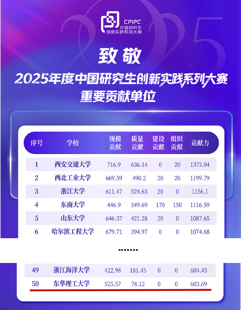 4月27日,2025年度中国研究生创新实践系列大赛重要贡献单位评选结果正式揭晓。东华理工大学综合贡献总得分603.69分,位列全国第50名,首次跻身全国五十强,是江西省唯一获此荣誉的高校。