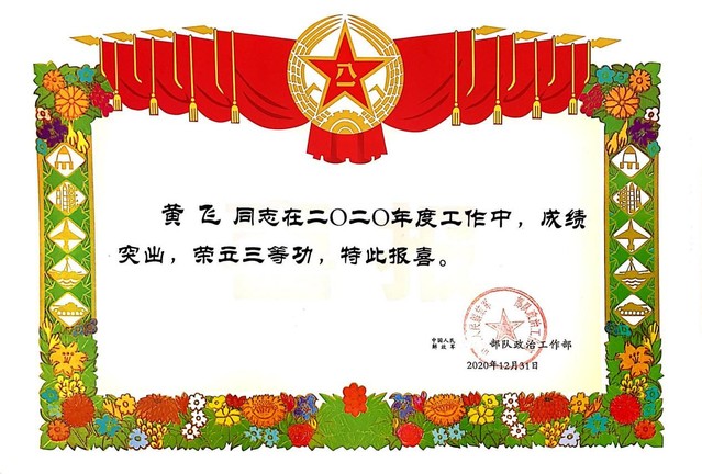 黄飞在部队任职期间,主要负责某种装备维护以及技术人员培训考核工作,于2015年组织参与了某型浮空平台系统培训,2016年组织参与我国海军引进国外某新型装备的培训,为部队提高基层技术人员专业水平、培养技术人才队伍作出了突出贡献,工作期间获得部队嘉奖两次。