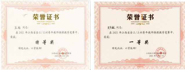 近日,2021年江西省金工/工训青年教师微课竞赛在南昌航空大学举行。来自南昌航空大学、华东交通大学和东华理工大学等全省九所高校的近20位选手参加了比赛。经过激烈角逐,共评出特等奖3名、一等奖5名。其中,我校机电学院王珏、史冬敏两位老师分别荣获特等奖及一等奖。