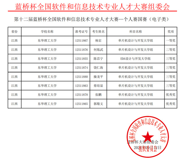 近日,由工业和信息化部人才交流中心举办的第十二届蓝桥杯全国软件和信息技术专业人才大赛全国总决赛结果揭晓。我校地球物理与测控技术学院李广老师指导的杨宏同学获得单片机设计与开发大学组一等奖,这是我校首次获得该赛事的电子类国家级一等奖。机械与电子工程学院黄河老师指导的何炼武同学获得二等奖,机械与电子工程学院郭文老师指导的陈苡宁等4位同学获得三等奖。