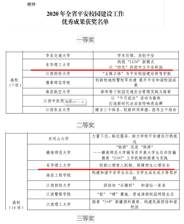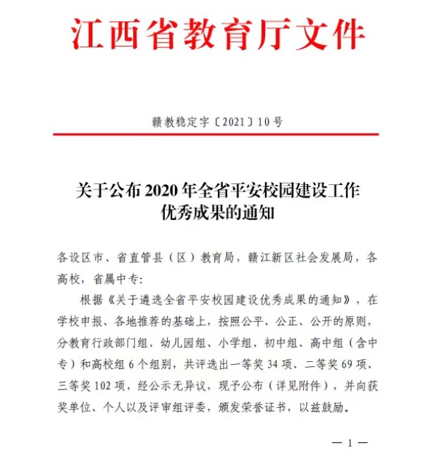 近日,江西省教育厅公布了2020年全省平安校园建设优秀成果评审结果,我校推送的三项成果分获高校组一、二、三等奖。