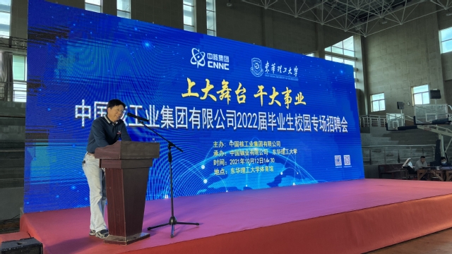 核工业集团二四〇研究所所长、党委副书记东华理工大学校友毛玉锋代表中核集团为毕业生作了招聘宣讲,介绍了集团概况、产业布局、组织架构、招聘政策以及集团取得的成就,鼓励我校毕业生踊跃参与招聘,为核工业技术进步和发展做出贡献。