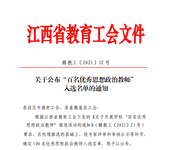 近日,江西省教育工会公布了“百名优秀思想政治教师”评选结果,全省大中小学共评选出100名优秀思想政治教师。我校马克思主义学院汪晓莺、华启和两位教授成功入选。