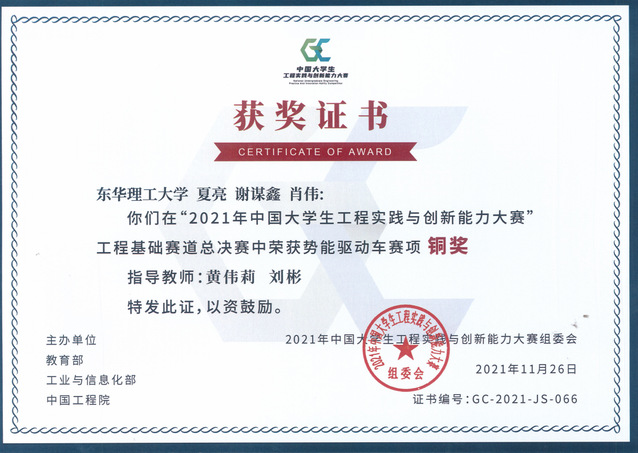 近日,由教育部、工业和信息化部以及中国工程院联合主办,清华大学承办的2021年中国大学生工程实践与创新能力大赛总决赛(以下简称:大赛总决赛)公布获奖名单,我校在本次大赛总决赛中获工程基础赛道——热能驱动车赛项一项、势能驱动车赛项铜奖一项
