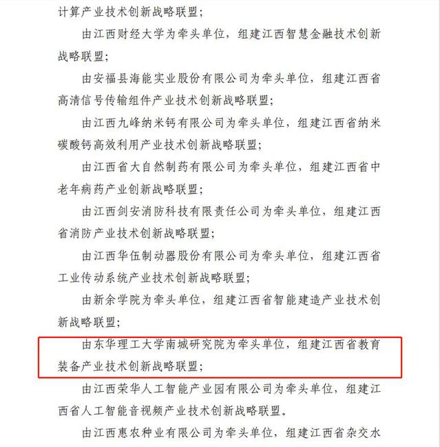 为加快建立以企业为主体、市场为导向、产学研相结合的技术创新体系,近日,江西省科技厅下发了《关于同意组建20个省级产业技术创新战略联盟的通知》(赣科发政字【2022】6号),由东华理工大学南城研究院为牵头单位,组建江西省教育装备产业技术创新战略联盟。
