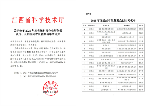 日前,江西省科技厅发布《关于公布2021年度省级科技企业孵化器认定、众创空间省级备案名单的通知》,公布了江西省2021年度众创空间备案名单,我校大学生创业孵化园成功获批“省级众创空间”。