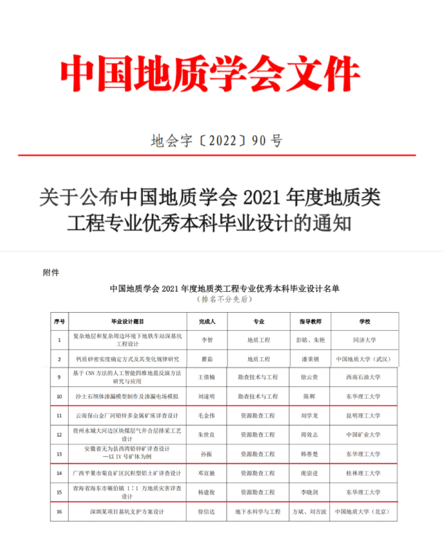 近日,中国地质学会下发《关于公布中国地质学会2021年度地质类工程专业优秀本科毕业设计的通知》(地学会〔2022〕90号),共评选出16篇优秀本科毕业设计,学校有3篇毕业设计入选。