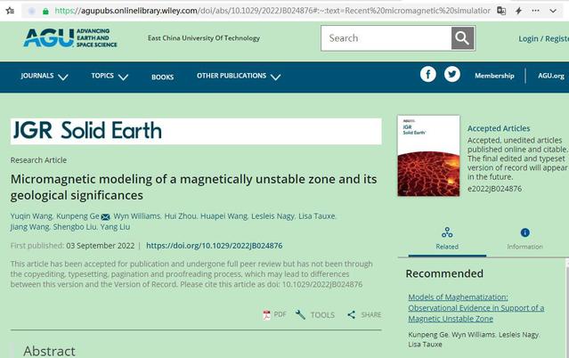 近日,我校地球物理与测控技术学院2019级地球物理学专业硕士研究生王宇钦在读期间作为第一作者,葛坤朋副教授作为通讯作者,在自然指数期刊Journal of Geophysical Research: Solid Earth上发表名为《Micromagnetic modeling of a magnetically unstable zone and its geological significances》研究成果。我校为第一署名单位。