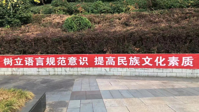 学校在校园主干道悬挂了多条推普宣传标语,在宣传橱窗和食堂等人流量大的宣传墙上张贴了推普宣传海报,向全校师生普及国家通用语言文字法和推普小知识。在微信公众号推送了推普宣传海报和短视频,做到了线上、线下全方位覆盖,激发了全校师生自觉热爱和规范使用祖国语言文字。