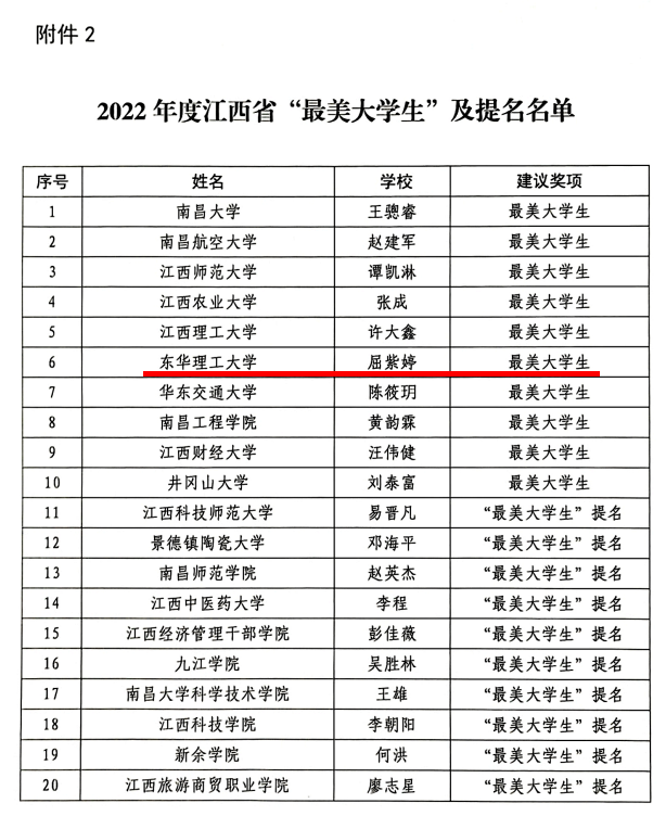 日前,省教育厅公布了2022年江西省“最美大学生”评选结果,我校理学院2018级本科生屈紫婷荣获该奖项,今年全省共评选出10名“最美大学生”。