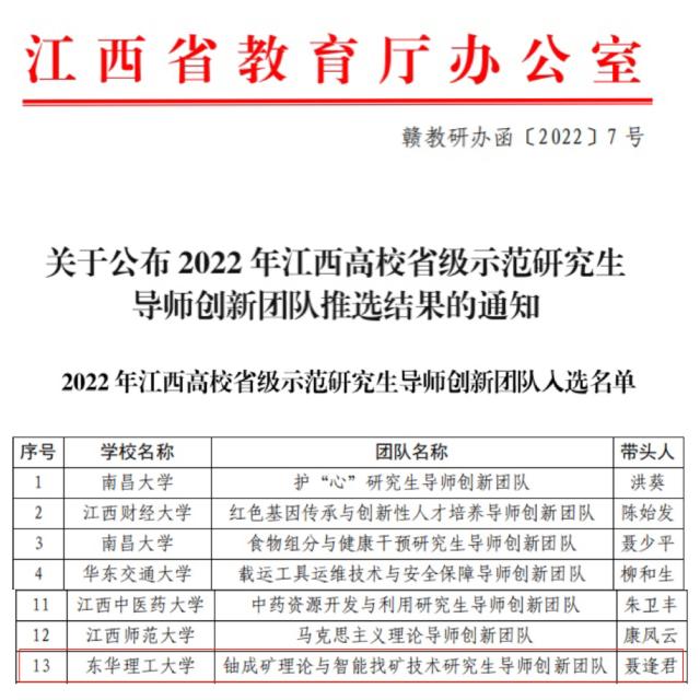 近日,江西省教育厅公布了《关于公布2022年江西高校省级示范研究生导师创新团队推选结果的通知》( 赣教研办函〔2022〕7号),我校聂逢君教授牵头的“铀成矿理论与智能找矿技术研究生导师创新团队”获批省级示范研究生导师创新团队。