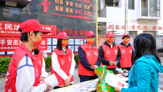 在活动现场,平安江西志愿服务队成员为市民发放《民法典》普法宣传册、宣传布袋、普法手持扇,用身边人、身边事向市民宣传《民法典》法律知识。广大市民积极参与,纷纷驻足并投入到志愿者生动有趣的普法宣传之中。带队老师在法律咨询点为市民现场解答民间借贷、交通事故、相邻关系、疫情防控等法律实务问题,并针对性地给出切实可行的解决建议。志愿服务队还组成两支小分队深入临街商铺、居民社区发放普法宣传册,宣传《民法典》知识,活动效果得到市民群众的一致好评。