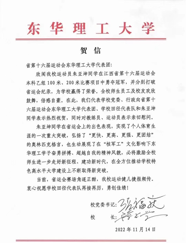 赛事当日,学校党委书记张福庆,校党委副书记、校长孙占学代表学校党委和行政给江西省第十六届运动会东华理工大学代表团发去贺信,热烈祝贺朱亚坤同学勇夺桂冠,并两次打破省运会纪录,同时对教练员和运动员表示亲切慰问。贺信中表示,朱亚坤同学在省运会上的出色表现,实现了个人体育生涯的一次重大突破,弘扬了“更快、更高、更强、更团结”的奥林匹克格言,也生动展现了在“核军工文化”影响下,东华理工学子奋勇拼搏、超越自我的精神风貌,必将激励全校师生进一步走好新征程,建功新时代,在全方位推动学校特色高水平大学建设上不断取得新突破。祝愿学校田径代表队再接再厉,勇创佳绩!