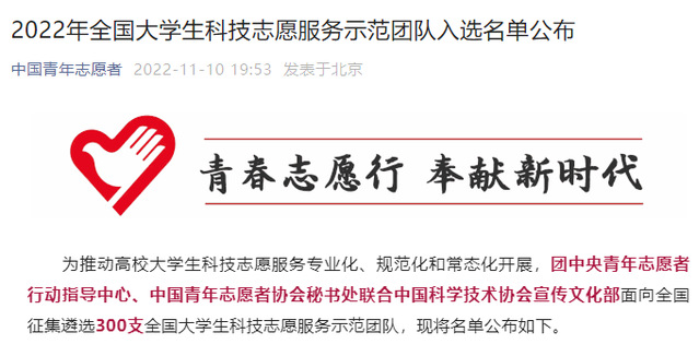 为推动高校大学生科技志愿服务专业化、规范化和常态化开展,团中央青年志愿者行动指导中心、中国青年志愿者协会秘书处联合中国科学技术协会宣传文化部面向全国征集遴选出300支全国大学生科技志愿服务示范团队,我校地球科学学院“青春地学”志愿服务队入选。