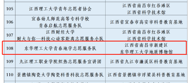 近年来,“青春地学”志愿服务队在校团委指导下,积极发挥青春先锋力量,充分利用学校地质博物馆资源,赴中小学和社区开展地质科普活动,先后被团中央通报表扬,获江西省大学生暑期“三下乡”社会实践活动优秀团队等荣誉。此次入选全国大学生科技志愿服务示范团队,充分展现了我校第一课堂与第二课堂相互促进融合的人才培养模式所取得的成绩。