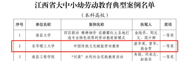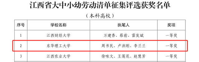 近日,江西省教育厅发布《关于公布江西省大中小幼劳动教育典型案例和劳动清单征集评选名单的通知》(赣教体艺办函〔2022〕32号),我校推荐的《中国传统文化赋能劳动教育》荣获全省劳动教育典型案例(本科高校)一等奖,《东华理工大学劳动清单》荣获全省劳动清单征集评选(本科高校)一等奖。