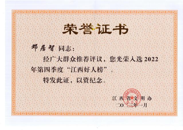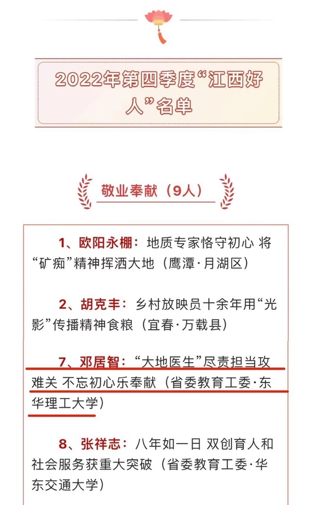 近日,全省道德模范与“身边好人”现场交流活动暨2022年第四季度“江西好人”发布仪式在景德镇隆重举行。该活动由江西省文明办主办,景德镇市委宣传部、景德镇市文明办承办,共评出2022年第四季度“江西好人”41人,我校邓居智教授获评。