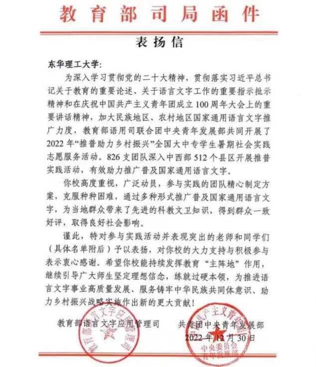 近日,教育部语言文字应用管理司、共青团中央青年发展部共同主办的2022年“推普助力乡村振兴”全国大中专学生暑期社会实践志愿服务活动评优结果揭晓,我校“赴江西省抚州市推普助力乡村振兴服务队”获“优秀团队”称号并获教育部语言文字应用司和共青团中央青年部来信表扬。