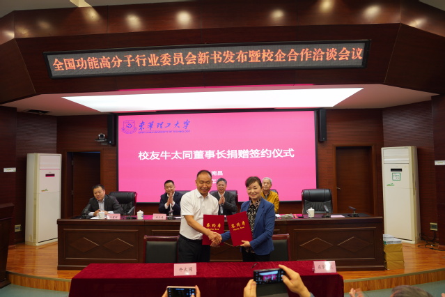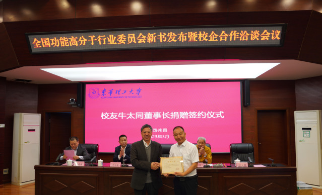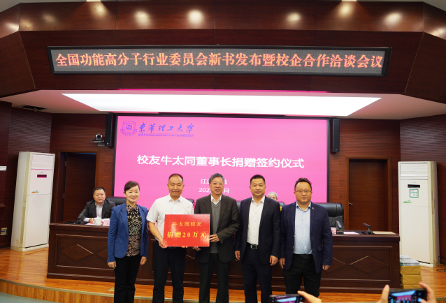 牛太同是东华理工大学1986届工业分析专业校友。此次牛太同向我校基金会捐赠20万元,用于“教室冠名认捐”等项目,并代表全国功能高分子行业委员会向学校捐赠100册图书,助力学校及化学生物与材料科学学院的发展。据悉,本次捐赠是学校教育发展基金会推出“教室冠名认捐项目”后的首笔认捐。