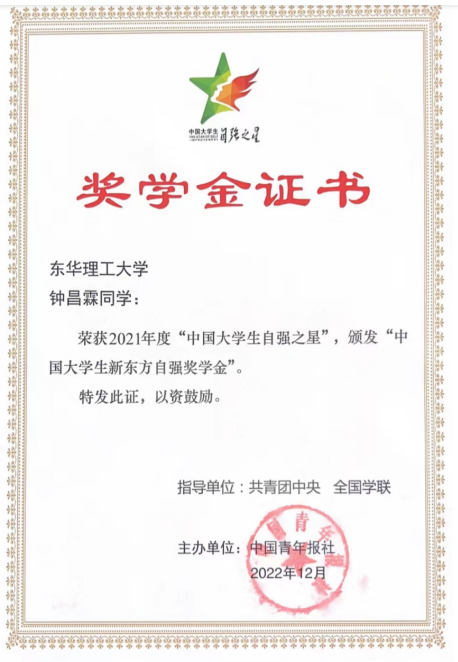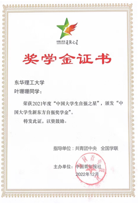 据悉,“中国大学生自强之星”奖学金评选活动自2007年开始举办,每年举办一届。评选对象重点来自相对困难家庭、地区且在志愿服务、社会实践、学术科研等方面事迹突出的青年学子。学校团委高度重视此项活动,积极开展各项评选申报工作。最终,钟昌霖、叶珊珊分别凭借在创新创业、社区实践的事迹荣获“中国自强之星”称号,生动展现了我校大学生热爱国家、担当奉献、勇于创新的良好精神面貌。