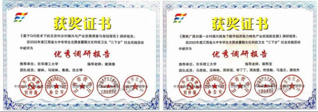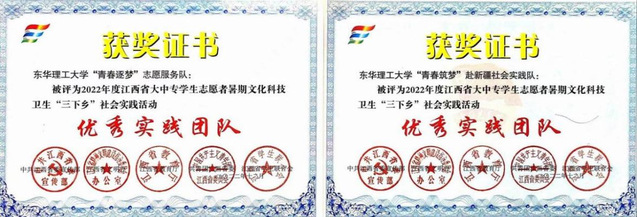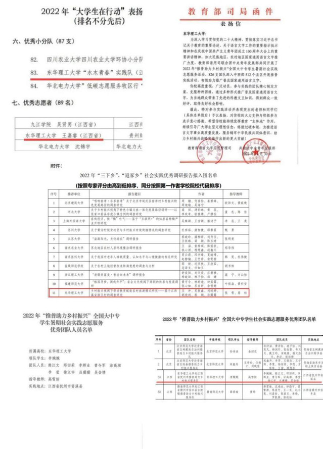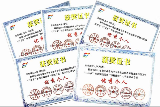 在《共青团江西省委等五部门关于2022年江西省大中专学生志愿者暑期“三下乡”社会实践活动的通报》中,校团委“青春筑梦”赴新疆社会实践队、地球物理与测控技术学院“青春逐梦”志愿服务队被评为优秀实践团队;代争争、姚金奎、易松、陈玉洁、陈雯5人荣获全省“三下乡”优秀个人称号;《基于GIS技术下的玉京村乡村振兴与产业发展调查与规划报告》《聚焦广昌白莲——乡村振兴视角下 数字经济助力特色产业实现新发展》被评为全省“三下乡”优秀调研报告;万杰、谭矴旭、马原驰、李宁、李宇琪5位同学荣获全省“扬帆计划”大学生实习专项优秀个人称号。此外,还有一批集体和个人分别荣获共青团中央、教育部语言文字应用司、中国环境科学学会表彰。