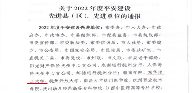 近日,抚州市平安建设领导小组下发《关于2022年度平安建设先进县(区)、先进单位的通报》,东华理工大学获评2022年度“抚州市平安建设先进单位”。