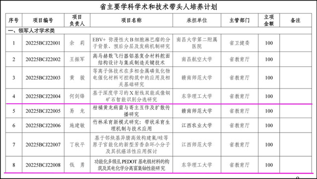 根据江西省科技厅相关文件的通知,东华理工大学何剑锋、钱勇两位教授入选江西省主要学科学术和技术带头人培养计划领军人才类项目,柳玉辉博士入选江西省主要学科学术和技术带头人培养计划青年人才类项目,三人共获资助经费250万元,创东华理工大学主要学科学术和技术带头人培养计划资助经费的历史新高,是东华理工大学在江西省主要学科学术带头人培养计划的新突破。