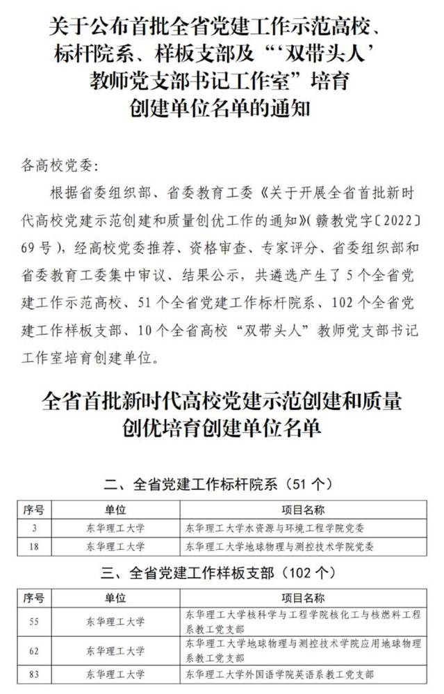 近日,省委组织部、省委教育工委公布了首批全省新时代党建示范创建和质量创优培育创建单位名单。东华理工大学地球物理与测控技术学院党委、水资源与环境工程学院党委入选为“全省党建工作标杆院系”培育创建单位,地球物理与测控技术学院应用地球物理系教工党支部、核科学与工程学院核化工与核燃料工程系教工党支部、外国语学院英语系教工党支部入选为“全省党建工作样板支部”培育创建单位。