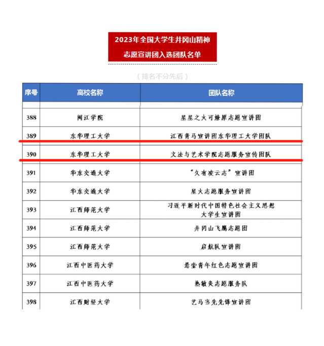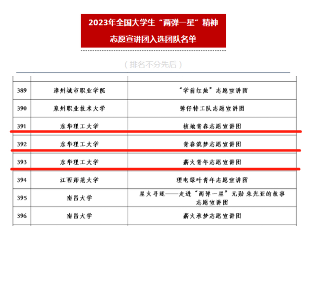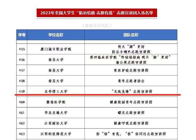 今年4月,团中央青年志愿者行动指导中心联合全国青少年井冈山革命传统教育基地、井冈山管理局、中国核工业集团有限公司、国家疾病预防控制局传染病防控司等单位开展了2023年“井冈山精神”“两弹一星”精神及“防治结核,志愿有我”志愿宣讲团队遴选活动。在近日公布的遴选活动结果中,东华理工大学团委选送的“青春筑梦”志愿宣讲团、马克思主义学院选送的江西青马宣讲团东华理工大学团队、校青协与医务所联合推送的“无疾先锋”志愿宣讲团等6支团队脱颖而出,成功入选三大系列全国志愿宣讲团队。
