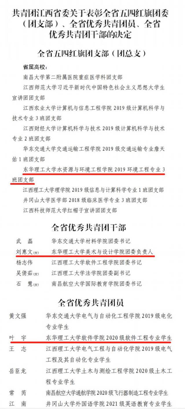 近日,共青团江西省委印发了《共青团江西省委关于表彰全省五四红旗团委(团支部)、全省优秀共青团员、全省优秀共青团干部的决定》(赣青发〔2023〕6号),对2022年度全省共青团先进典型进行表彰,东华理工大学水资源与环境工程学院2019环境工程专业3班团支部获2022年度“全省五四红旗团支部”称号;美术与设计学院刘惠文老师获“全省优秀共青团干部”称号;软件学院叶宇同学获“全省优秀共青团员”称号。