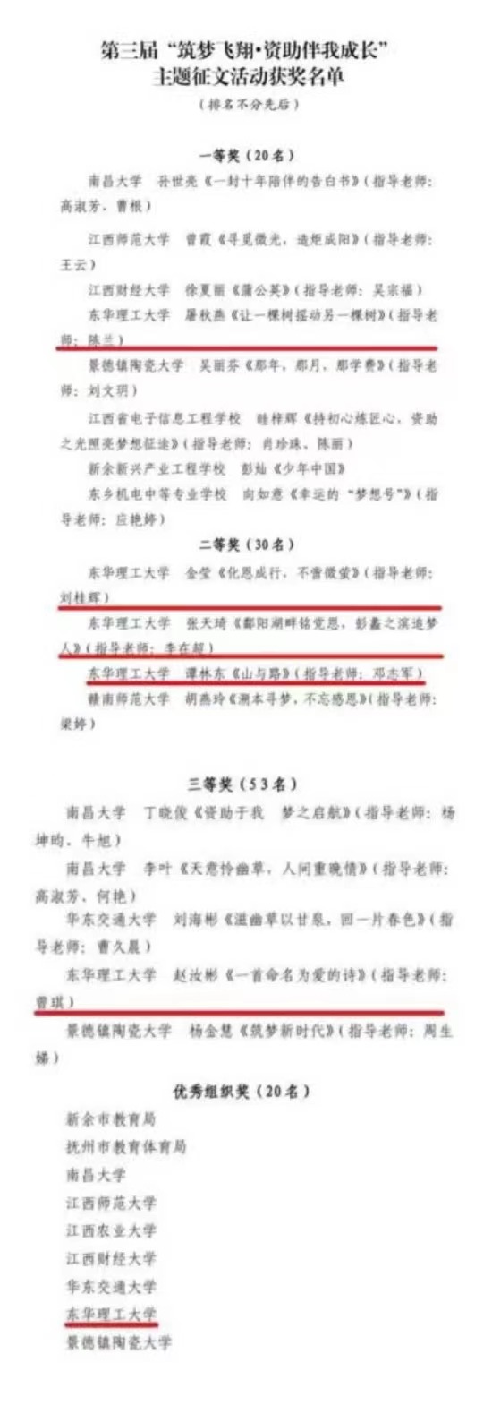 近日,江西省教育厅举行第三届“筑梦飞翔·资助伴我成长”主题征文活动颁奖典礼,东华理工大学获得一等奖1项,二等奖3项,三等奖1项,并荣获“优秀组织奖”。据悉,在本次评选活动中,江西省教育厅共收到参赛作品8666篇,经各地各校初审、专家评审委员会终审等程序,最终评出优秀组织奖20个,优秀征文奖103项(含并列4名)。
