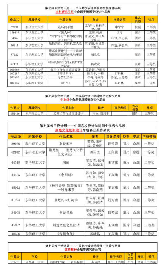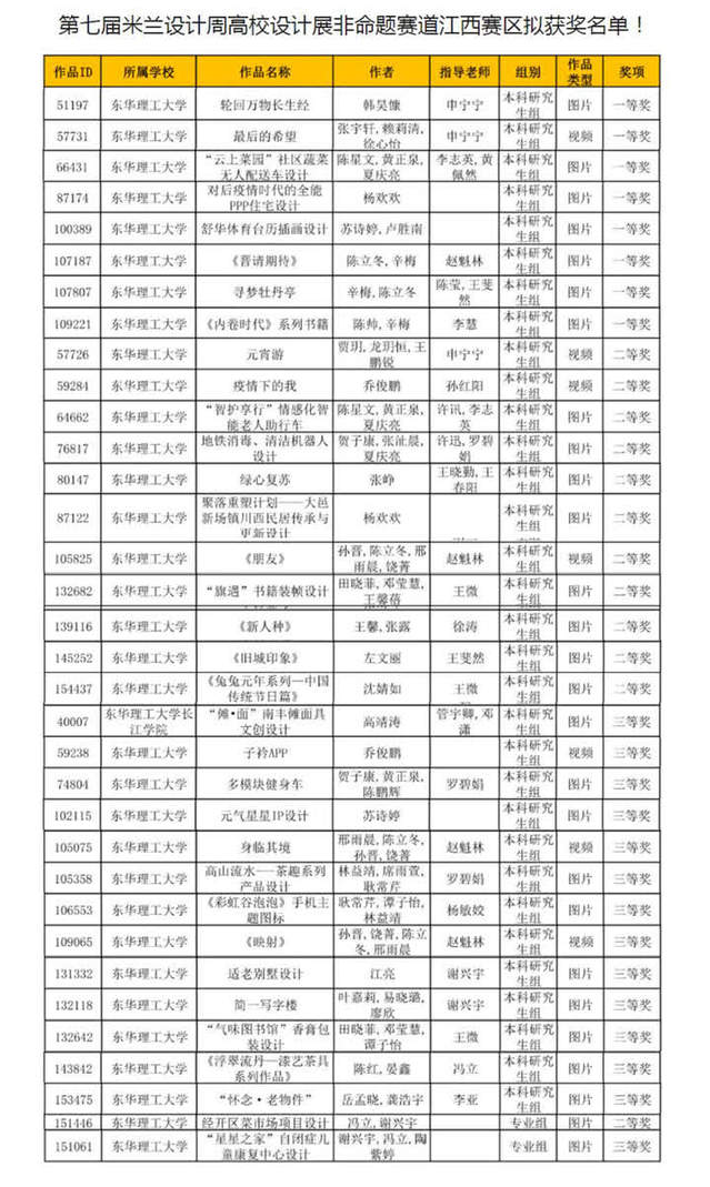 近日,2023年第七届米兰设计周——中国高校设计学科师生优秀作品展国赛评审落下帷幕。东华理工大学作为大赛江西赛区的承办单位,积极组织师生参与备赛,最终在此次比赛中荣获国家级奖项21项,其中一等奖2项、二等奖6项、三等奖13项;荣获省级奖项33项,其中一等奖8项,二等奖12项,三等奖14项。
