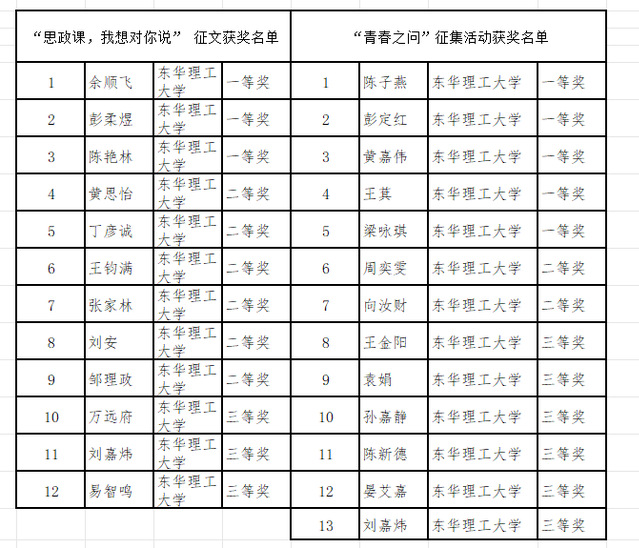 近日,江西省教育厅公布了江西省大学生“思政课,我想对你说”征文和“青春之问”征集活动获奖名单,东华理工大学在“思政课,我想对你说”征文活动中获一等奖3个、二等奖6个、三等奖3个,“青春之问”征集活动中获一等奖5个、二等奖2个、三等奖6个。