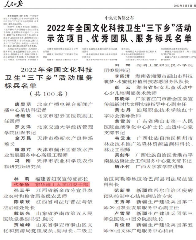 近日,中央宣传部公布2022年全国文化科技卫生“三下乡”活动示范项目、优秀团队、服务标兵名单。东华理工大学代争争老师作为省内唯一高校代表,获评2022年全国文化科技卫生“三下乡”活动服务标兵,全国共评选100名。