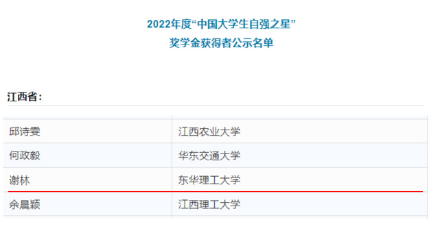 近日,由共青团中央、全国学联指导,中国青年报社、新东方教育科技集团、中国青年创业就业基金会联合会举办的2022年度“中国大学生自强之星”奖学金推报活动结果揭晓,东华理工大学地球科学学院资源勘查工程专业2020级本科生谢林荣获2022年度“中国大学生自强之星”奖学金。