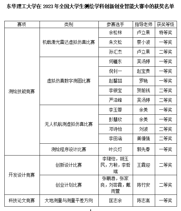 2023年7月29日至30日,全国大学生测绘学科创新创业智能大赛在中南大学举行,东华理工大学测绘与空间信息工程学院学子获特等奖1项、一等奖8项、二等奖7项。