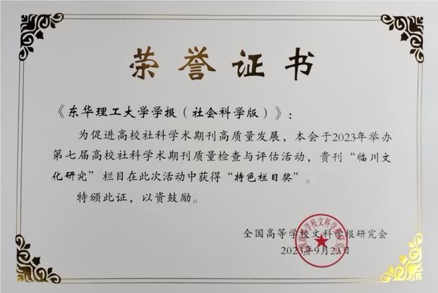 近日,在全国高等学校文科学报研究会举办的第七届高校社科学术期刊质量检查与评估活动中,《东华理工大学学报(社会科学版)》荣获“全国高校优秀社科期刊”,其中“临川文化研究”栏目获得“特色栏目奖”。