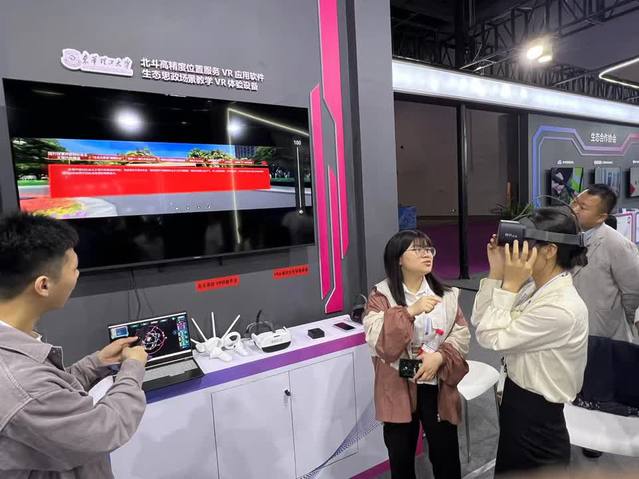 近年,东华理工大学积极响应江西VR产业发展战略,形成了“北斗高精度位置服务及应用软件”“生态文明与思政课协同育人实践教学基地场景教学和VR体验”“工业互联网攻击渗透虚拟仿真实验”“医用电子直线加速器的放射治疗虚拟仿真实验”等研究成果。其中,东华理工大学测绘与空间信息工程学院研发的“北斗高精度位置服务及应用软件”与马克思主义学院研发的“生态文明与思政课协同育人实践教学基地场景教学和VR体验”在会上进行了展示,给观众留下了深刻印象。