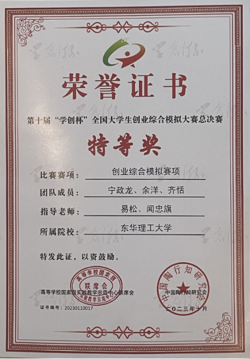 近日,由黑龙江大学承办的第十届“学创杯”全国大学生创业综合模拟大赛总决赛落下帷幕。由东华理工大学经济与管理学院宁政龙、余洋、齐恬三位同学组成的队伍在全国总决赛中荣获全国总决赛特等奖,实现了学校在该赛事中的最佳成绩和新突破。