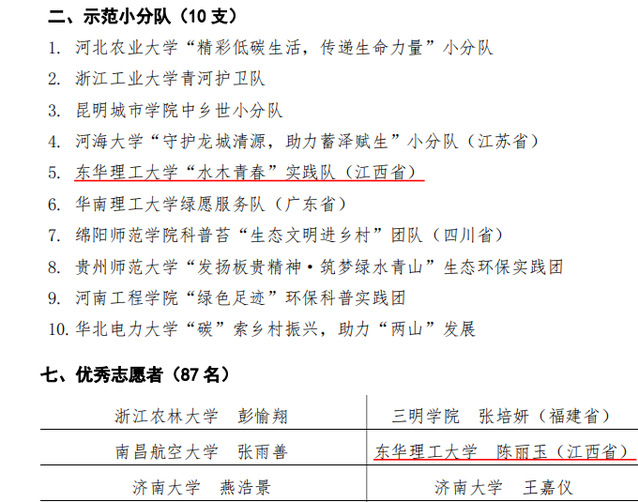 近日,中国环境科学学会公布了2023年“大学生在行动”生态环保科普活动优秀组织单位和个人表扬名单。东华理工大学“水木青春”实践队荣获“示范小分队”称号(全国仅10支),2021级水文与水资源工程专业陈丽玉同学获得“优秀志愿者”称号。该活动吸引了全国18个省(市)环境科学学会,160余所高校的9000多名大学生志愿者参与。