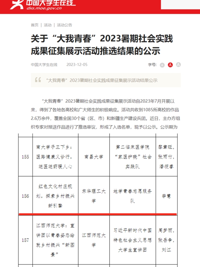 近日,由中国大学生在线主办的“大我青春”2023暑期社会实践成果征集展示活动的推选结果公布。东华理工大学“地学青春”志愿服务队作品《红色文化村庄规划,探索乡村振兴新引擎》获评实践风采类优秀作品。