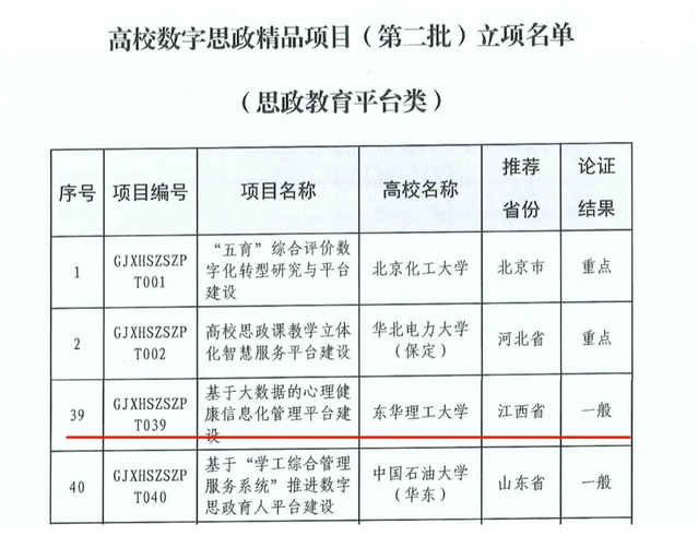 近日,中国高等教育学会公布了第二批高校数字思政精品项目(思政教育资源类)立项名单,由东华理工大学党委学生工作部牵头申报的“基于大数据的心理健康信息化管理平台建设”项目获批立项(全国思政教育平台类共获批项目61项),江西省仅有3项入选。