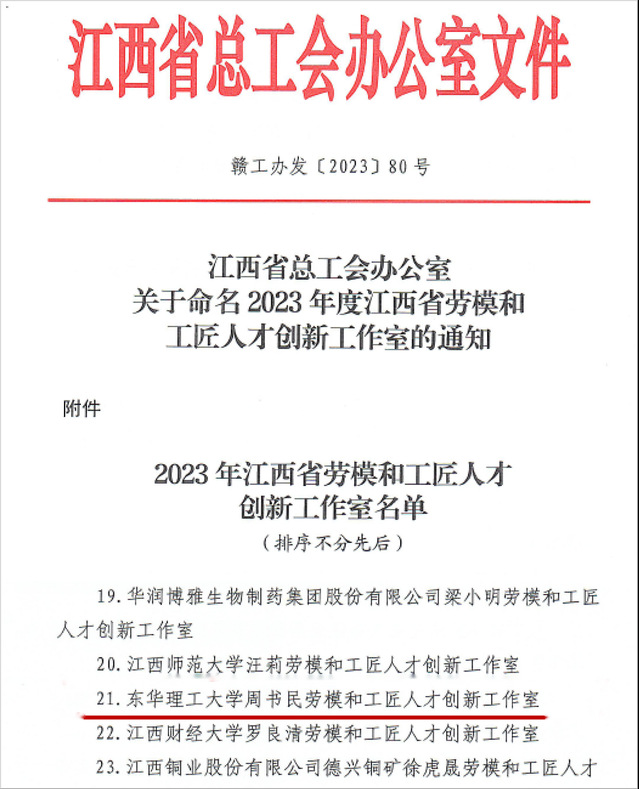 近日,省总工会公布了2023年度“江西省劳模和工匠人才创新工作室”名单,东华理工大学周书民教授领衔的工作室成功获评“东华理工大学周书民劳模和工匠人才创新工作室”称号,全省共有30个工作室获评。