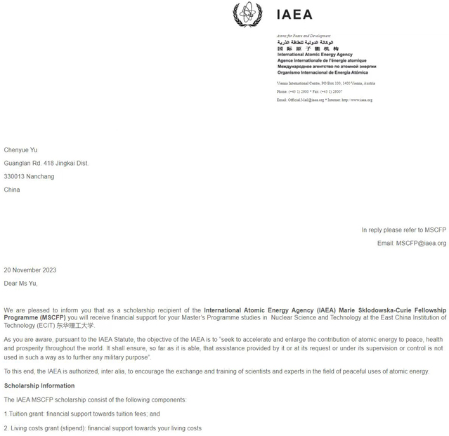 近日,国际原子能机构(IAEA)公布2023年度玛丽·斯科洛多夫斯卡·居里夫人奖学金(MSCFP)评选结果,东华理工大学核科学与工程学院核科学与技术专业2023级硕士研究生于辰悦同学荣获奖学金,全国仅有4名。